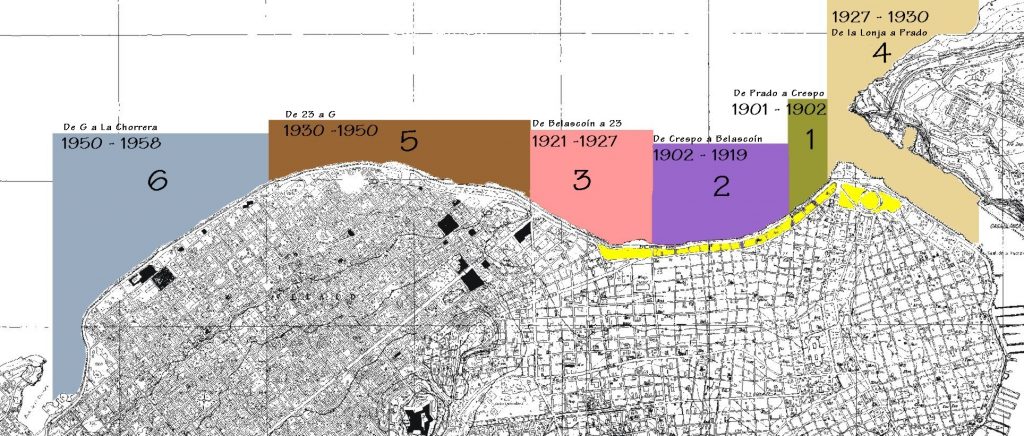 A construção do Malecón levou ao todo 57 anos para ser concluída, feita em 6 etapas diferentes, começando em 1901 e terminando em 1958. Na foto abaixo temos uma ilustração das 6 etapas ao longo da costa litorânea de Havana e a duração de cada uma delas.